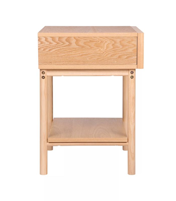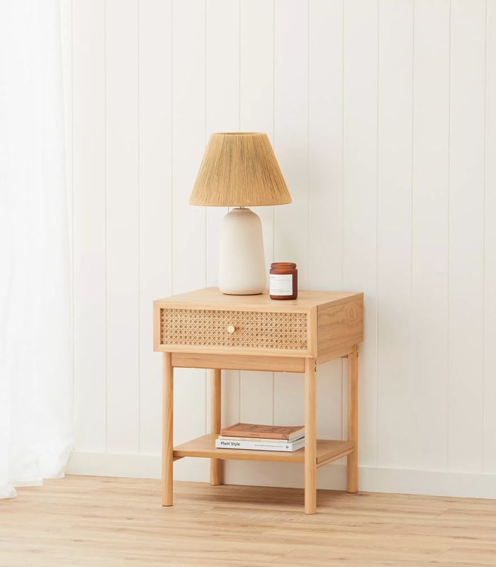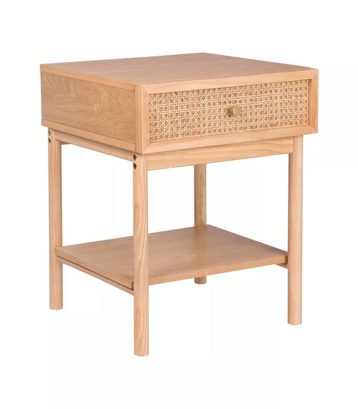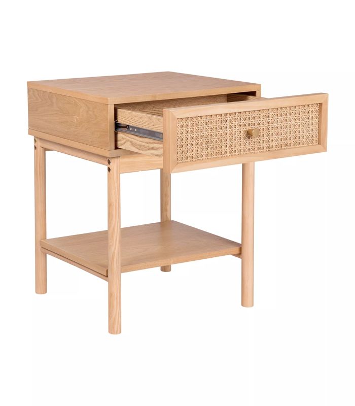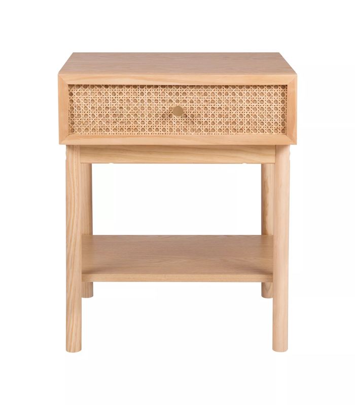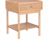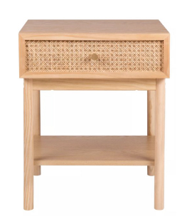 - Một chiếc bàn đầu giường với khung chắc chắn bằng gỗ và ngăn kéo chèn mây, tác phẩm này mang đến sự duyên dáng mộc mạc, bền bỉ. Kích thước: 500 x 400 x 550