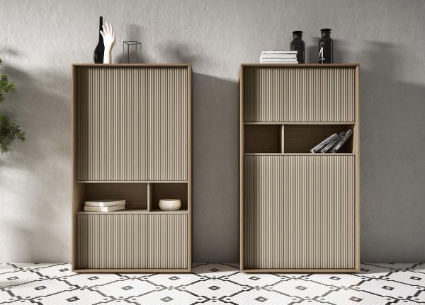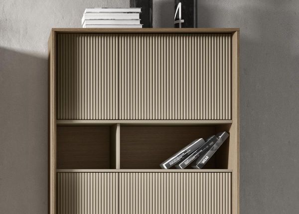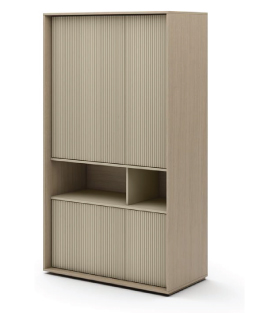 - Tủ có bốn cánh cửa không tay nắm không đối xứng có gờ đẹp mắt được đặt hơi lõm vào một khung thanh mảnh hiện đại, với một ngăn mở ở giữa. Kích thước: 800 x 400 x 1800