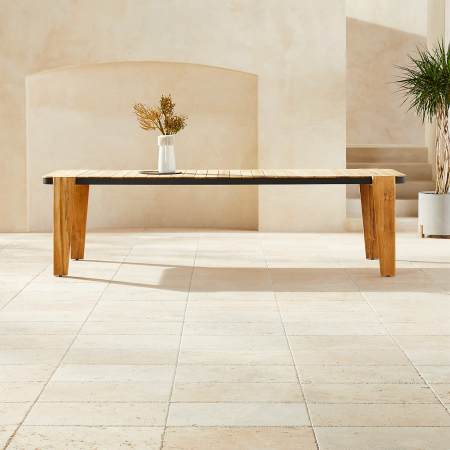 - Bàn ăn ngoài trời được chế tác tự gỗ tự nhiên chắc chắc. nổi bật với viền nhôm đen mờ tạo nên góc cạnh hiện địa độc đáo. Kích thước: 2600 x 1000 x 750