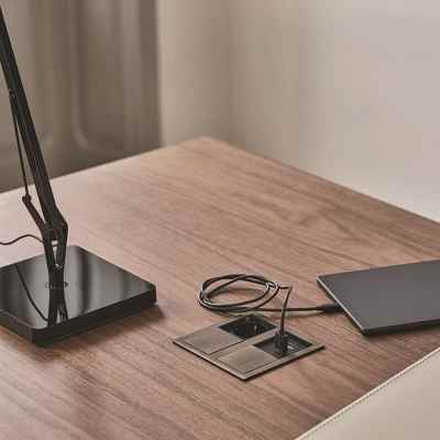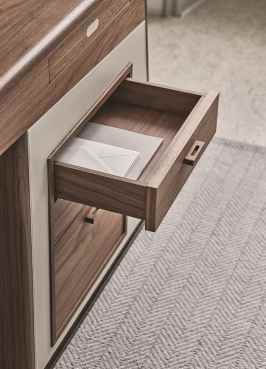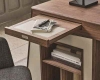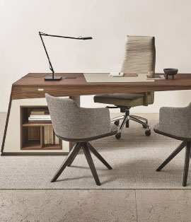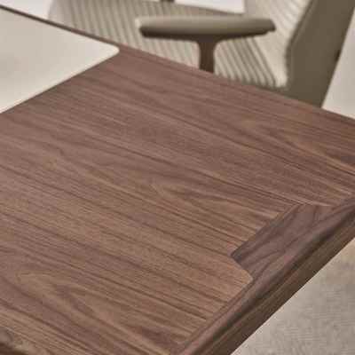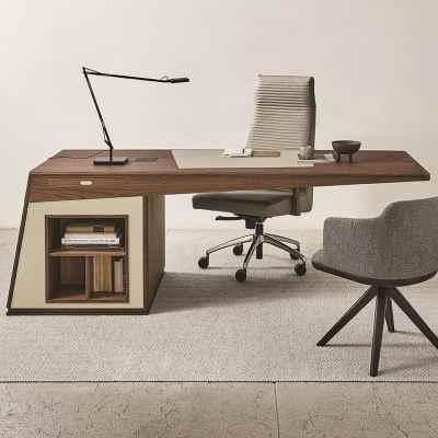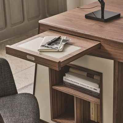 - Một chiếc bàn bằng gỗ óc chó kết hợp với các đệm da làm tổng thể thêm phần đẹp mắt. Tủ bên được trang bị kệ kéo, ngăn kéo và ngăn mở để đựng những vật dụng cá nhân. Kích thước: 1600 x 850 x 750